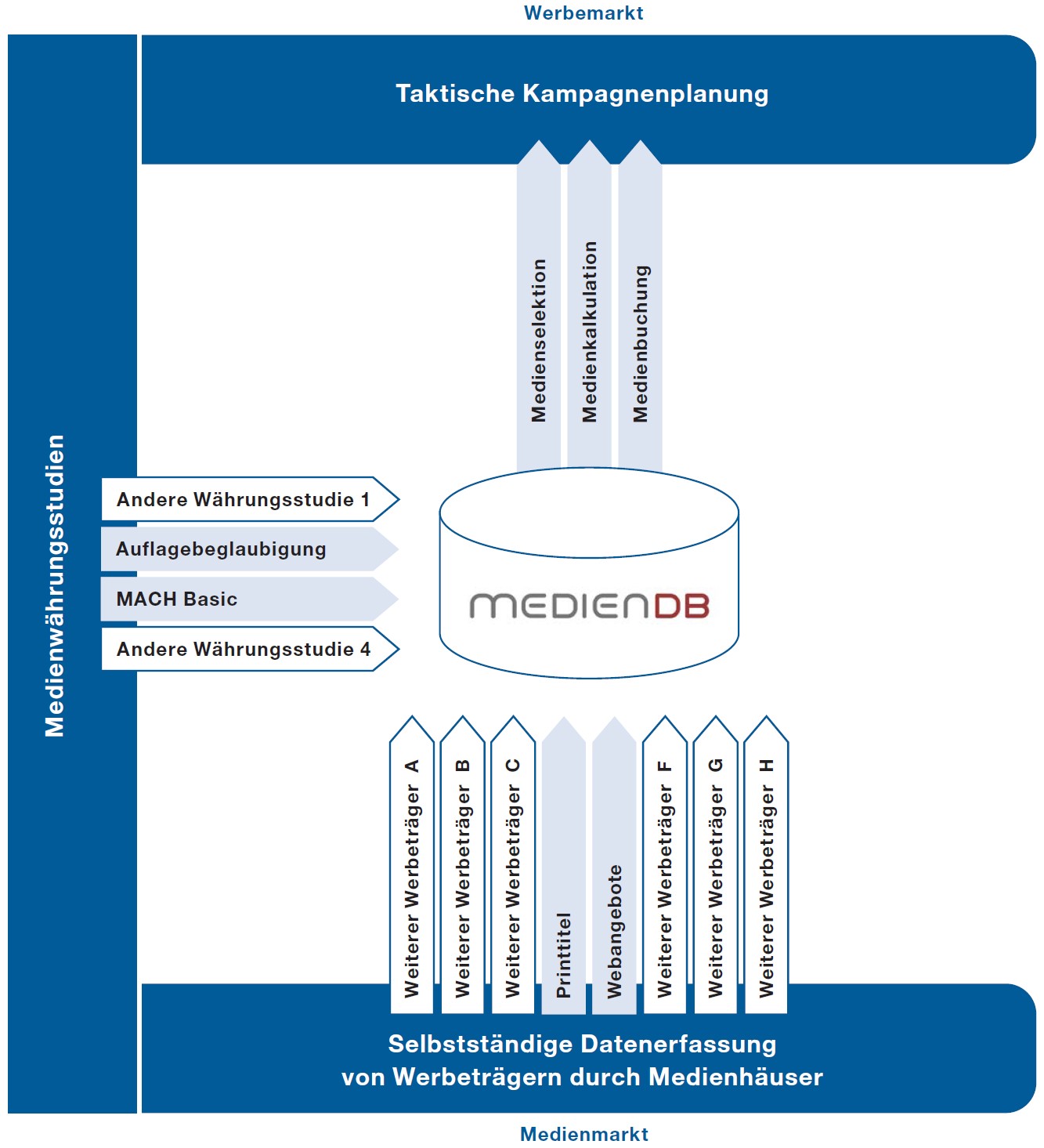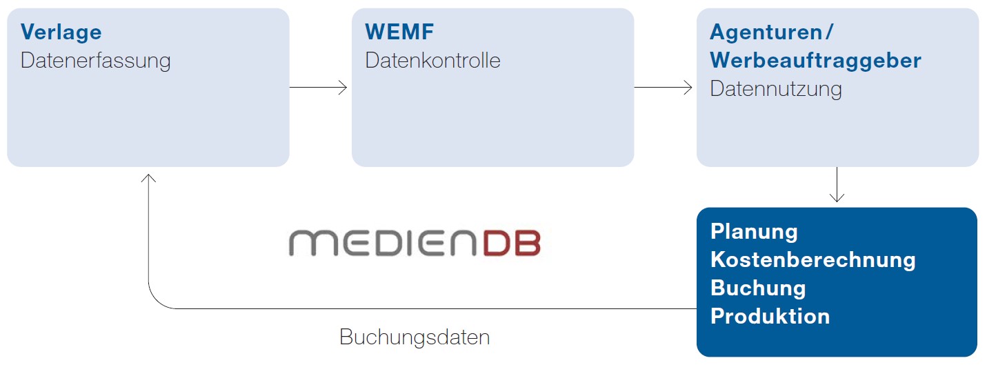 «MedienDB» ist der Kurzname für die Mediendatenbank der WEMF. Diese Datenbank enthält die Angebote werberelevanter Publikationen (Print und Online), welche durch Ihre Teilnahme an der MedienDB für den Schweizer Werbemarkt jederzeit sichtbar, erreichbar, planbar, kalkulierbar und buchbar sind. Die Medienhäuser erfassen ihre Daten in der MedienDB selbst und garantieren damit inhaltliche Qualität und Aktualität.